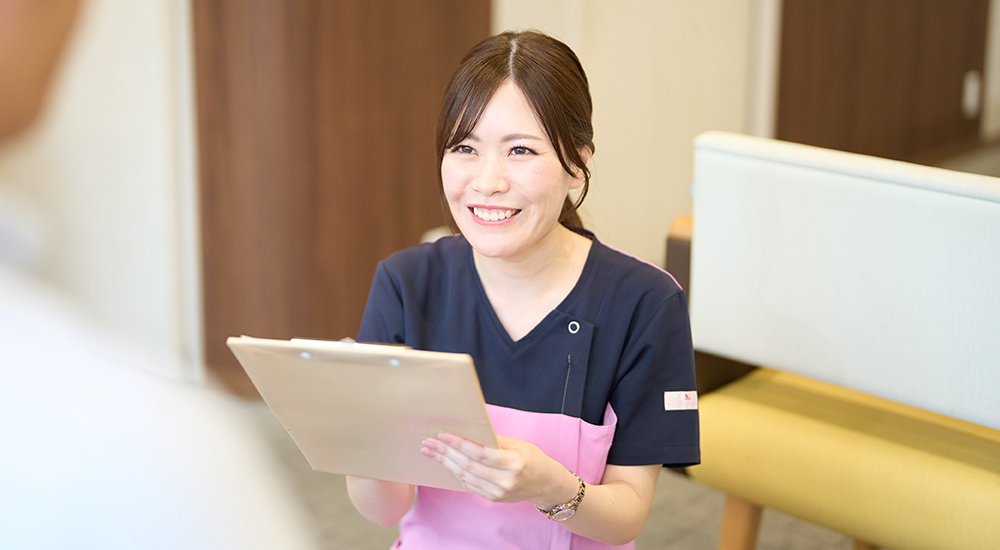 人間関係がすごくいい職場だと感じます。「チームワークを良くしましょう」というのが院長の方針でもあり、困っていれば必ずサポートしてもらえます。誰もが自然と協力し合う雰囲気で、忙しいときもできるだけ全員が早く帰れるように工夫しています。病棟勤務との大きな違いは夜勤がなく、生活リズムが安定すること。また、患者さんに対してより一層、寄り添えるようになったと感じます。元気になっていく過程を間近でしっかりと見られるのはクリニックならではですね。